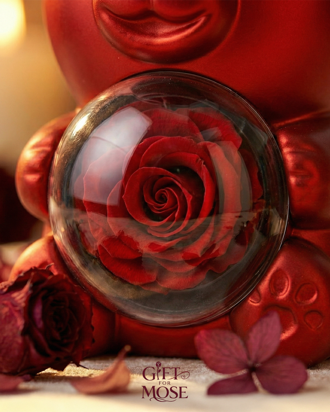 Delight someone special with this refined decorative gift that blends timeless charm with lasting beauty. Standing at 15.5 cm tall, this compact piece features a classic bear design that gently rotates to reveal a real rose at its center. It is the ideal "all-in-one" gift set for anniversaries, birthdays, or Valentine's Day.